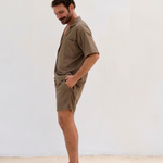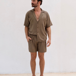 Confeccionado en lino 100% natural, este set está diseñado para ofrecer frescura, comodidad y una estética relajada en climas cálidos. La camisa de manga corta y corte relajado se distingue por su cuello tipo cubano, botones de coco y bolsillos frontales funcionales, aportando un equilibrio entre sofisticación y naturalidad. El canesú estructurado en la espalda asegura un calce limpio y una caída cuidada.