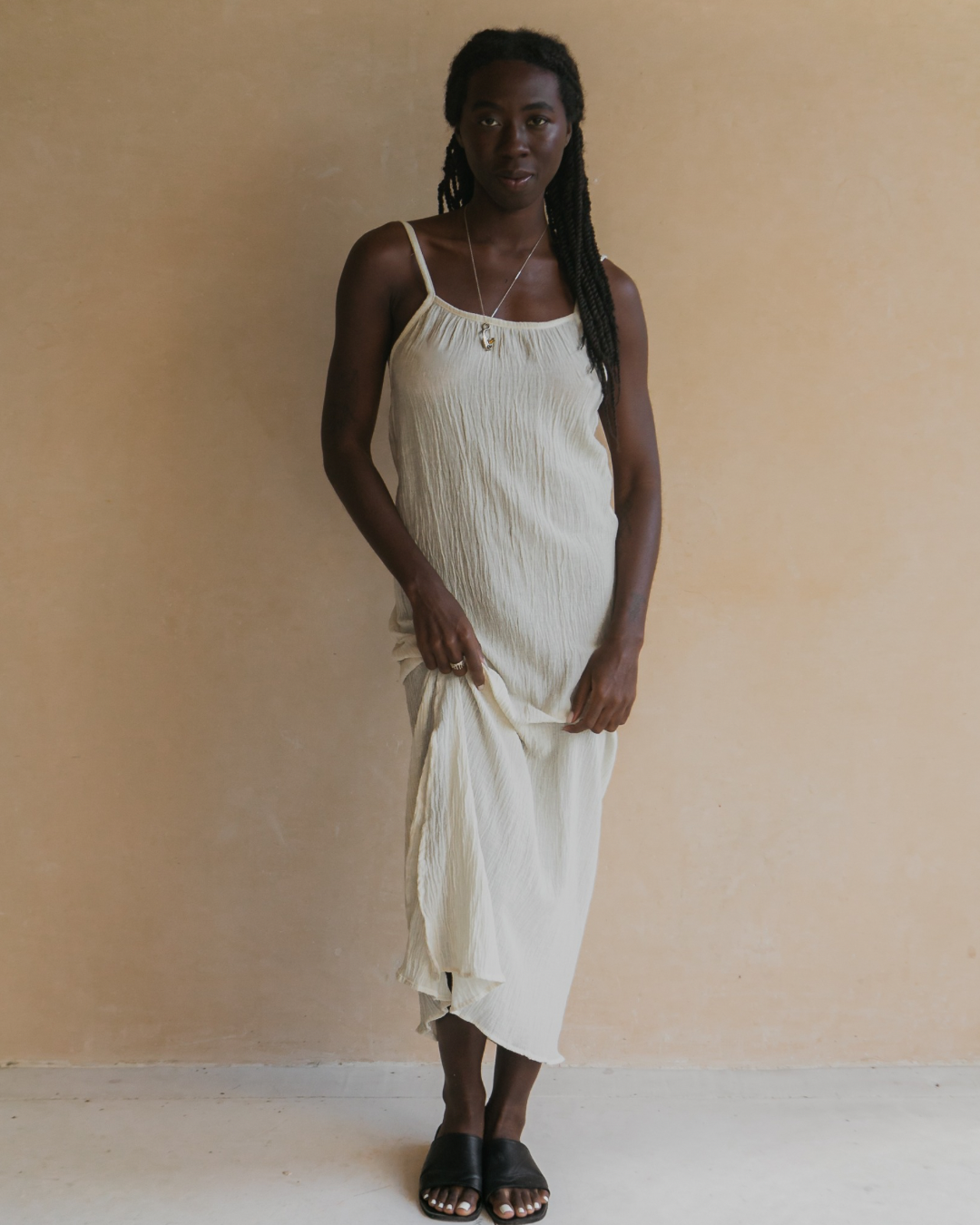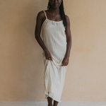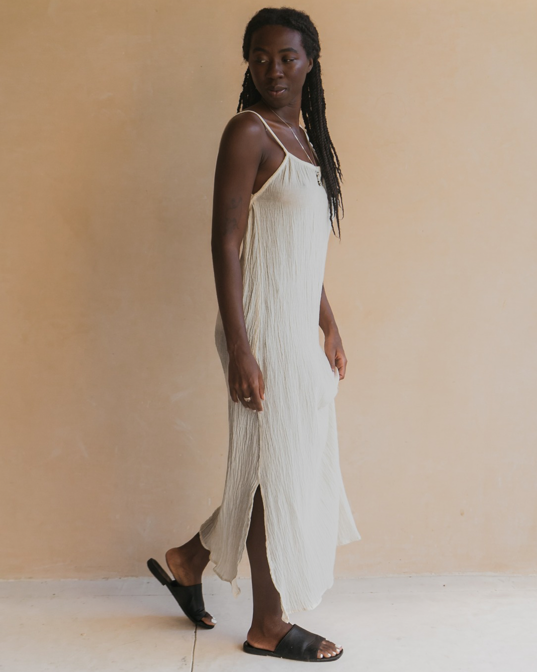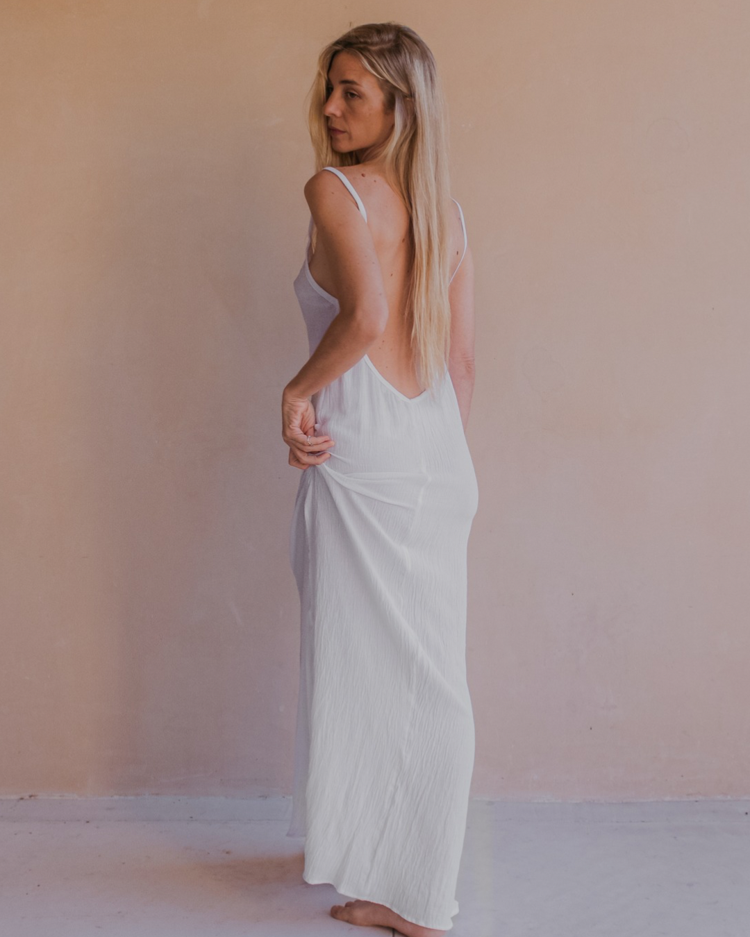 El vestido Catenaria es un elegante y versátil diseño que combina comodidad y estilo. Confeccionado con una suave manta de algodón, este vestido sin mangas es ideal para cualquier ocasión. Su silueta fluida y larga crea un efecto envolvente y sofisticado.